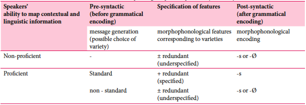The pre-syntactic choice of variety related to awareness of contextual, social and interlocutors’ information can be compared to a sort of bilingualism. Bilinguals need to necessarily take into account contextual information in order to inhibit one of the languages so the other can be produced. In the results presented, some 6th graders are able to identify contextual properties and inhibit non-standard forms in order to produce the standard variety.