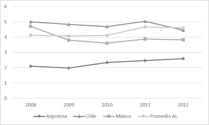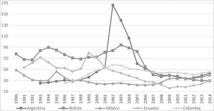 Por lo tanto, la imposibilidad del financiamiento a partir de la emisión monetaria y la recurrente privatización del sector bancario abren una nueva posibilidad para el incremento del endeudamiento público, a través de la colocación de títulos valores como bonos tanto en el mercado interno como en el externo. Si se revisa la dinámica de la deuda en algunos países de la región (Figura 1), se evidencia su dependencia del contexto en lugar de su racionamiento5. Por ejemplo, en Argentina la deuda creció exponencialmente durante la crisis económica de inicios de este siglo; asimismo, en Colombia se observa un aumento sostenido durante la segunda mitad de los noventa con ocasión del proceso de endeudamiento subnacional que se generó por la caída de las transferencias y las mayores atribuciones de gasto (Bonet, Pérez & Ayala, 2014).