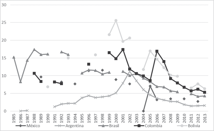 La Figura 5 presenta el porcentaje de la población pobre o en estado de indigencia en cinco países de América Latina entre 1985 y 2013, siguiendo para esto el enfoque del Banco Mundial que supone tomar una línea de pobreza igual a 3.1 dólares diarios (2011, en términos de Paridad de Poder Adquisitivo, PPP). No se tomaron las líneas de pobreza nacionales, porque ello implicaba una mayor pérdida de observaciones. En general, se advierte que a pesar de algunos casos aislados, la década del noventa se caracterizó por un incremento de este indicador, que solo desde el primer lustro de este siglo empezó a ceder.