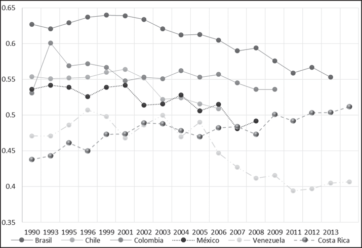Por otra parte, la Figura 6 muestra que en general hubo un crecimiento de la desigualdad, medida a través del Gini, en la región a lo largo de los noventa, década en que estuvo especialmente vigente el Consenso de Washington. Sin embargo, lo importante acá es que también se verifica que la profundidad de los cambios en la materia fueron disímiles, sobresaliendo casos como el de Colombia, que exhibió un dramático aumento de la desigualdad en la primera mitad de los noventa, o Venezuela que, por otro lado, es el país que mayor éxito presenta en la lucha contra este fenómeno (particularmente desde 2005)7.