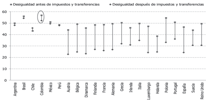 Como se observa en la Figura 7, no solo los países de América Latina, por lo general, parten de una distribución del ingreso más desigual en relación con sus pares desarrollados, sino que además el efecto redistributivo de sus políticas fiscales (i.e., tributos y gasto público) es reducido. En efecto, autores como Steiner y Cañas (2013) y Jiménez (2015) ponen de manifiesto la insuficiencia de la política económica en América Latina para tratar fenómenos como la desigualdad. Una importante razón para esto es la renuncia de base tributaria que suponen diversos beneficios tributarios; por ejemplo, las exenciones que muchas veces se concentran en los más ricos.