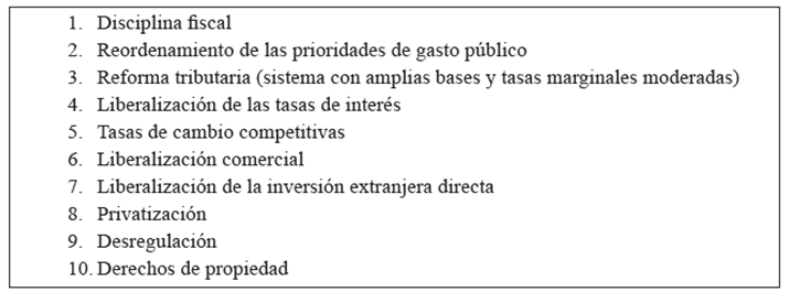 Básicamente, los diez instrumentos de política que se presentaban como adecuados para velar por la sostenibilidad y el crecimiento de los países deudores y específicamente de los países latinoamericanos (Tabla 1), se desarrollaban como medidas apropiadas ante el fracaso de las políticas empleadas por estos últimos desde 1950. El término Consenso de Washington surgió precisamente del favoritismo que las políticas expresadas en el documento What Washington means by policy reform recibían de buena parte de los altos mandos de la tecnocracia con sede en Washington, como las instituciones financieras internacionales, las agencias económicas de Estados Unidos y la Reserva Federal.