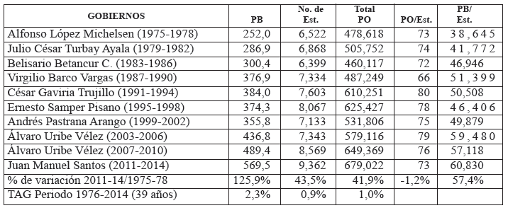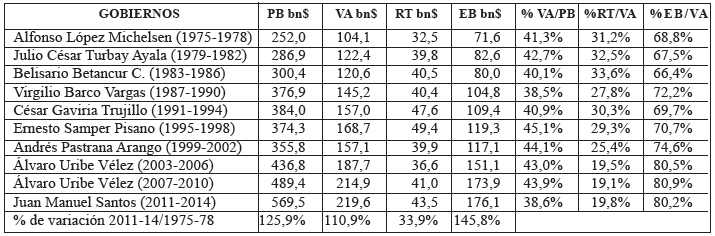 En la Tabla 1 se muestran los valores absolutos y relativos encontrados para esos conceptos durante los últimos diez gobiernos nacionales en la industria colombiana, en donde cada gobierno se toma como un momento histórico para facilitar la comparación, esto es, los valores absolutos para cada concepto o variable corresponden a la suma del respectivo cuatrienio, convertidos los valores corrientes a pesos del año 2005, utilizando los resultados del Sistema de Cuentas Nacionales base 2005 para la deflactación. Los valores relativos corresponden al cálculo sobre esos valores acumulados.