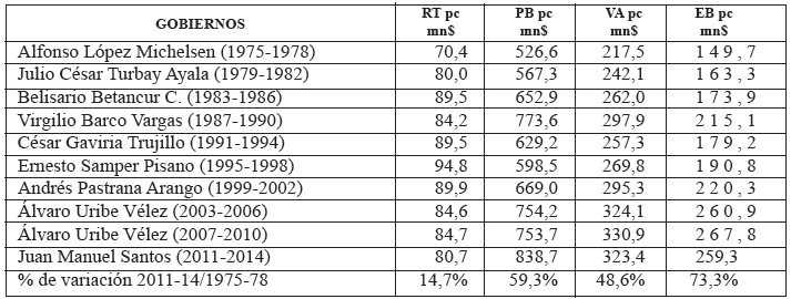 En el caso de la relaciones entre los trabajadores y los dueños de los medios de producción -que en economía política marxista también se llama la relación trabajo-capital-, la situación en la industria manufacturera colombiana durante el transcurso de la segunda parte del siglo 209 y principios del siglo 21 fue muy cambiante, teniendo su punto de inflexión hacia finales de los años ochenta y principios de los noventa, cuando entró en vigencia una reforma laboral que flexibilizó las condiciones de contratación y despido de los trabajadores. En la Tabla 2, preparada con base en cifras absolutas de la Tabla 1, se observa que en el curso de esos diez gobiernos la remuneración promedio por cuatrienio y trabajador remunerado aumentó hasta la segunda parte de la década de los noventa, pues pasó de $70,4 millones en 1975-1978 a $94,8 millones en 1995 1998, en pesos constantes de 2005, lo que implicó un incremento de casi el 35 % en 24 años, seis gobiernos; en los cuatro cuatrienios siguientes disminuye de manera progresiva la remuneración per cápita hasta $80,7 millones en la administración Santos Calderón, o sea se perdió un 15 %; en todo el lapso 1975 2014, 40 años, la remuneración promedio solo mejoró en casi 15 %, mientras que el solo mejoró en casi 15 %, mientras que el excedente bruto por trabajador ocupado bruto por trabajador ocupado aumentó en más del 70 %, pues pasó de casi $150 millones en 1975-78 a casi $260 millones en 2011-2014, en pesos de 2005. Estas cifras, por sí solas, evidencian la inequidad en la distribución de la riqueza creada.