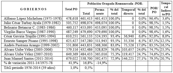 Pero la situación para los trabajadores, en general, es más crítica, pues una porción creciente de la población ocupada remunerada corresponde a temporales directos, puesto que su cantidad aumentó de un poco menos de 37.000 trabajadores, como promedio en el cuatrienio de Gaviria Trujillo (primer Gobierno en que empezó a utilizarse esta categoría en las estadísticas laborales), hasta más de 146.000 trabajadores en la primera administración de Santos Calderón, como se aprecia en la misma Tabla 3; ya en los últimos gobiernos se acerca o pasa del 25 %, esto es, alrededor de uno de cada cuatro trabajadores ocupados remunerados es temporal directo, esto es, contratado por las mismas empresas industriales.
