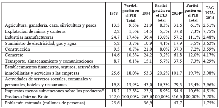 En una investigación que adelantan lo autores de este artículo sobre los eventuales efectos internos de la transnacionalización de grandes empresas y conglomerados colombianos -efectos que deben existir, aunque no es fácil detectarlos-, muchos pertenecientes a los principales grupos financieros del país, uno de los objetivos es analizar la evolución de la industria manufacturera1 durante el lapso 1975-2014, con base en la nueva serie del Sistema de Cuentas Nacionales que publica el Departamento Administrativo Nacional de Estadística (DANE) con base 2005, en donde al mismo tiempo se ha ampliado la "canasta" de bienes y servicios que comprenden el PIB, pues de este sector proviene la mayoría de los conglomerados que se han proyectado hacia el exterior2, teniendo presencia directa en dos o más países diferentes a Colombia (Silva-Colmenares & Padilla-Pardo, 2015). Como lo han comprobado distintas investigaciones, en muchos países el peso relativo del consumo intermedio en la composición básica de la producción industrial ha aumentado, con disminución del otro componente, el valor agregado, al tiempo que también se ha modificado la composición del valor agregado con detrimento de la parte porcentual que corresponde a la remuneración al trabajo humano e incremento de la parte que va para el capital y otros factores no salariales. Pero esto último no solo ocurrió en la industria, sino para todo el conjunto de la economía.