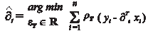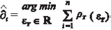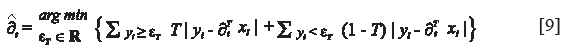 En la ecuación 9 se puede ver que todas las observaciones mayores a ∂Tt xi son estimadas por ∂tx con peso en T, y en las menores x∂t con peso en (1 - T). También se ven las observaciones mayores que el valor absoluto de la diferencia entre las observaciones y el valor óptimo, las cuales tienen una ponderación de orden T y las observaciones menores tienen una ponderación de orden (1 - T).