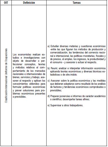 La OIT (2008) afirma que "los economistas realizan estudios o investigaciones con el objeto de desarrollar o perfeccionar conceptos, teorías, y métodos relativos al comportamiento de mercados..."; de donde se presume que la categoría economista está sujeta a la existencia de mercados, cuya función es la de formular políticas económicas y prever soluciones para problemas económicos sin ninguna consideración normativa acerca del resultado que persiguen las diferentes técnicas o políticas económicas, con lo cual no es posible distinguir en dicha definición el interés público del interés privado.