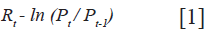 Donde Rt es el retorno esperado en el instante t, ln es el logaritmo natural, Pt es el precio promedio de venta del producto agrícola durante la semana y P-1 el precio de venta promedio de dicho producto en la semana anterior.