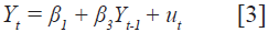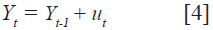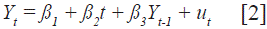 Donde ut es un término de error de ruido blanco (se distribuye normalmente con media = 0 y varianza = 1), t es el tiempo medido cronológicamente, Yt la realización de la serie, β1 indica el valor de deriva, β2 la tendencia temporal y β3 la raíz del proceso. Con la característica de presentar un -1 ≤ β3≥ 1 Donde si β3= 1 se conoce como raíz unitaria que indica un modelo de caminata aleatoria y, por tanto, se entiende que es un proceso estocástico no estacionario. Como hipótesis nula se evalúa que el modelo de regresión presenta un problema de raíz unitaria H01: β1 ≠ 0, β2 ≠ 0, β3= 1; H11: Caso contrario.