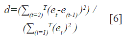 Indicando que β3 representa el grado de correlación de la muestra de los residuos. d=2 indica que no hay auto-correlación (Durbin & Watson, 1951). Como hipótesis nula se evalúa que no existe autocorrelation en la serie, es decir: H05: P(d=2); H15:Caso contrario. En el presente trabajo es utilizado el paquete estadístico "lmtest" desarrollado en R por Zeileis y Hothorn (2002).