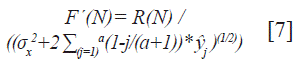 j. son los estimadores de varianza y covarianza de la serie, α el tamaño de la subserie, R(N) el rango de datos de la subserie.