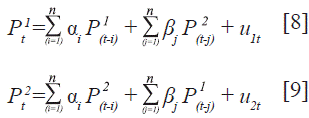 Para la aplicación de la metodología se realizan tres pasos básicos: 1) seleccionar series estacionarias y que tengan presencia en todas las centrales de abastos, 2) evaluar el efecto de rezagos de cada par de series (mismo producto para cada par de CA) y 3) identificar relaciones entre los mercados. El efecto de los rezagos y la causalidad se puede expresar mediante las siguientes ecuaciones: