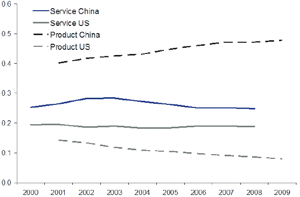 The OCA view states that the greater the degree of trade with a country, the larger the benefits gained from exchange rate fixation. Figure 11 charts the bilateral trade intensities (in percent) of Hong Kong with US and with China for 2000-2009. With respect to product trade, Hong Kong's level of trade with China had not only been about four times as large as that with US but had also been rising steadily throughout the period. On the contrary, the degree of trade with US had been declining gradually. Similarly, for service trade with Hong Kong, China's share is substantially larger than the US one.