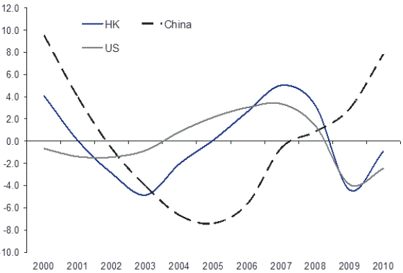 Secondly, with respect to business cycle symmetry, Figure 12 reveals that for 2000-2003, Hong Kong is relatively parallel with China but for 2004-2010, Hong Kong is more symmetrical with US. In this regard, it seems that Hong Kong was more convergent with US in the booming years leading to the subprime episode and the years thereafter.