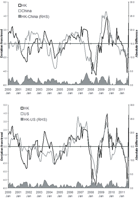 Fourthly, real interest rate cycle synchronicity is represented by the charts in Figure 14. For each chart, the left axis represents deviations from trend (or cycles) of the real interest rate series whilst the right axis indicates absolute differences between the cycles. The left chart compares the HK and the China cycle whilst the right chart compares the HK and US cycle. From the charts, one can find that the HK cycle is more convergent with the US cycle. Also, though Hong Kong's monetary policy is not directly linked to China's, the HK cycle is also notably parallel with China's.