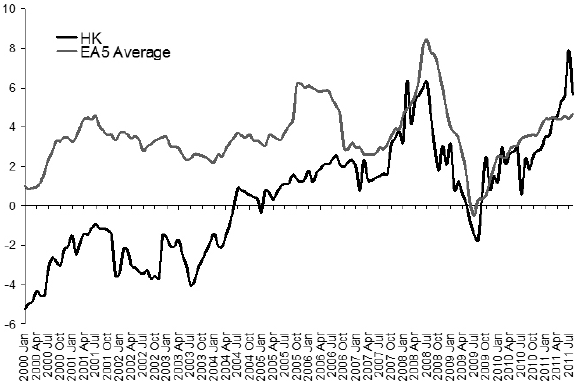 In this regard, sharp build-up of foreign exchange reserves was too big to be fully offset by domestic monetary sterilization operations. The resulting loss of monetary control contributed to higher inflation (CPI) since 20073, to a level as high as the EA5 average, as shown in Figure 4. After the 2009 recession, prices in Hong Kong grew more quickly, surpassing the EA5's in 2011.