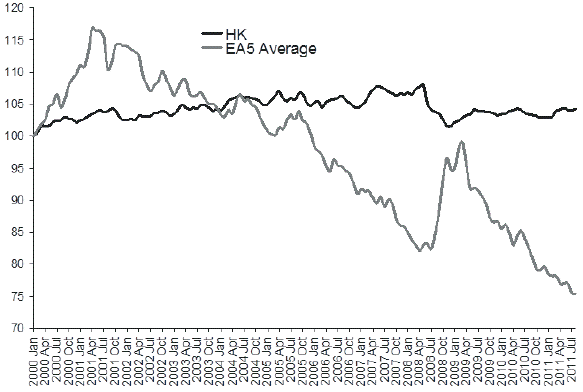 This is made apparent by the exceptional growth of foreign exchange reserves during the global crisis in 2008-09, as revealed in Figure 2. The stock of reserves not only rose faster than in the earlier years but also more rapidly than the EA5 average after a temporal fall during the credit crunch in the Eurodollar market in the second half of 2008 that affected emerging Asian countries too. In fact, in a short period of 3 years of 2008-11, the US dollar value of Hong Kong's foreign exchange reserves rose almost twofold -from $160 billion to $280 billion-. As for the EA5 countries which embrace more flexible exchange rates, their foreign reserves have not risen as rapidly as Hong Kong's.
