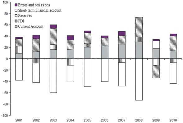 Pertaining to reserve, a "negative" value actually indicates an addition to the reserve pool. This is clear when one examines the annual balance of payments of China in Figure 8 which records consistent current account surpluses that were financed by accumulation of foreign reserves. In 2009-2010, short-term financial balances of China were also positive, signifying influx of hot money to China.