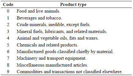 Following Nguyen (2007), the degree of export diversification is measured by a diversification index, namely the inverse of the period average of the annual Herfindahl index which is a common indicator of degree of specialisation. The Herfindahl index is computed as H = Σn.i=1Si2 where Si. is share of the export of product i, and n is the number of products exported. The higher the value of this diversification index, the more diversified the exports. Since data of individual export products are unavailable, annual export data according to the first-digit sub-industries of the United Nation Standard International Trade Classification (SITC) Revision 2 are used. The categories are displayed in Table 1.