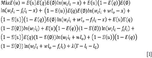 El trabajador, como un agente racional, se enfrenta a la disyuntiva de cómo asignar su tiempo para obtener la mayor cantidad de ingresos posibles. Si trabaja recibirá un salario (w), si delinque obtiene un ingreso (wi)4. Sin embargo, reconoce que si delinque existe la probabilidad (1 - E(q)) de ser aprehendido y castigado, por lo que se le impondrá una sanción, que para fines de este modelo se asume que la sanción es económica y depende del tiempo que empleó para delinquir (fili). Por otra parte, si opta por ofrecer su trabajo a un empleo legal, existe la probabilidad de que no sea contratado, dicha probabilidad está dada por la expectativa de la tasa de desempleo (£(u)). Por lo tanto, el trabajador se enfrenta a la incertidumbre de ser aprehendido y castigado si se dedica a delinquir o a la incertidumbre de no ser contratado y quedar desempleado.