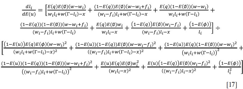 La ecuación [2] muestra que el consumidor maximiza su función objetivo, cuando la utilidad marginal que obtiene por delinquir es igual a la conseguida por trabajar. La ecuación [3] simplemente muestra que el tiempo disponible una vez descontado el tiempo dedicado al ocio, debe gastarse entre delinquir y trabajar en actividades legales.