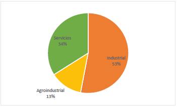 El número total de empresas localizadas en el territorio colombiano en 2015 llegaba a un total de 772, las cuales ascendieron a 850 en 2016, con una inversión acumulada de 17 761 millones de dólares y una producción de servicios del 34 % y productos industriales de 53 % (ver Figura 2). La mayor parte de las empresas producen en ZF de las ciudades y regiones con más alta densidad urbana y crecimiento regional, como las mencionadas anteriormente, aspecto que consolida las economías de aglomeración que tienden a disminuir los costos de producción y, por lo mismo, a mejorar la competitividad interna e internacional (Asociación de Zonas Francas de las Américas [AZFA], 2017). La producción industrial es muy variada y comprende bienes y servicios desde cosméticos, dulces, metalmecánica, motocicletas, energía, salud, servicios portuarios hasta BPO y RPO.