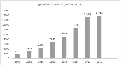 Colombia se vuelve cada vez más atractiva para el capital internacional, en la actividad económica general y en las ZF. En particular, la inversión en ZF se comportó de manera dinámica en el periodo 2009-2016, aunque, como ya se señaló, esta se concentra en las regiones de mayor desarrollo relativo. La inversión aumentó de manera significativa a lo largo del periodo señalado y, como se aprecia en la Figura 3, el mayor volumen de inversión se alcanza en 2016, con un total de 17 771 millones de dólares, lo cual implica que desde 2009 el monto de la misma se multiplicó por diez.
