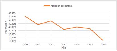 El crecimiento anual de la inversión en ZF se muestra irregular y con tendencia a la baja, como se aprecia en la Figura 4. Básicamente, la tendencia de crecimiento es mayor entre los años 2011-2012 y 2013-2014 en relación con los demás periodos.
