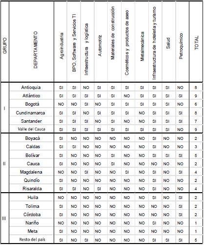 Tipo III: Huila, Tolima y Córdoba cuentan con la presencia de dos sectores cada una, Nariño y Meta tienen un sector y el resto del país tiene cinco. Se destaca la ausencia absoluta de "BPO, Software y Servicios TI", "Automotriz", "Materiales de Construcción", "Cosméticos y Productos de Aseo" y "Metalmecánica"; es decir, que las regiones periféricas no disponen de industrias con alto valor agregado ni sofisticación tecnológica.