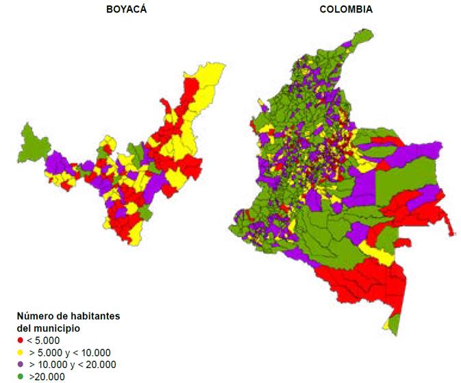 Como consecuencia de ello, la estructura demográfica boyacense tiene una particularidad latente que se puede denominar como sobremunicipalización del territorio, en relación con la reducida cantidad de habitantes por cada uno de sus municipios. En efecto, según datos proyectados del DANE (2005a), en 2016 Boyacá es el segundo departamento del país con el mayor número de municipios (con 123), superado solamente por Antioquia que tiene 1252. Así mismo, es el cuarto departamento con menor número de habitantes por municipio con 10 391 personas promedio, solo más alta que Guainía, Amazonas y Vaupés, territorios claramente particulares por su contexto socioeconómico y geográfico. Este diagnóstico se hace mucho más evidente en la Figura 1, en la cual se demuestra que Boyacá ostenta una mayor proporción de municipios con reducida población (colores rojo y amarillo), que aquella proporción evidenciada en el resto del país. En general, para el 2015 Boyacá cuenta con 62 municipios de menos de 5000 habitantes, 38 entre 5000 y 10 000 personas, 15 entre 10 000 y 20 000, y solo ocho municipalidades que superan los 20 000 residentes. En esta medida, el departamento se caracteriza por contener municipios poblacionalmente reducidos.