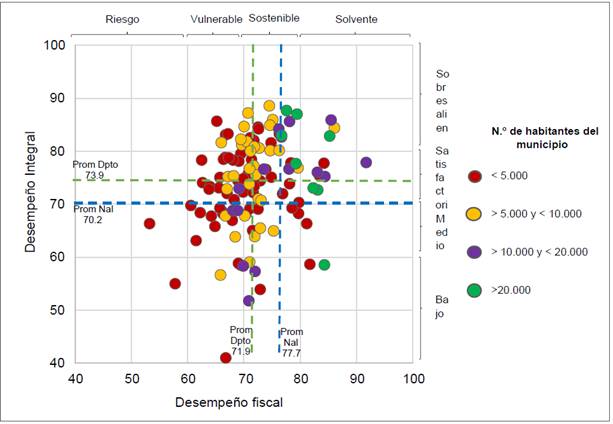 De este modo, ya hechas las precisiones conceptuales, la Figura 2 representa los resultados conjuntos de desempeño fiscal e integral para los municipios de Boyacá en el año 2015, desagregados por el tamaño poblacional de los mismos. La distribución por colores permite diferenciar entre municipios de acuerdo con su demografía. Los puntos de municipios ubicados en la parte superior derecha de la gráfica son aquellos con óptimas condiciones fiscales y administrativas, contrario a aquellos que se encuentran en el sector inferior-izquierdo de la misma, con los rendimientos más bajos de la muestra. Los resultados se evalúan a continuación.