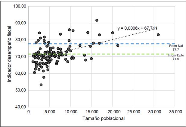 También, el indicador promedio de desempeño fiscal por grupos de municipios nota un resultado diferencial, el cual desciende de forma progresiva entre más reducido es el tamaño poblacional. En efecto, para el caso de las entidades con más de 20 000 habitantes (puntos color verde), observadas para el caso boyacense como ciudades, obtuvieron un indicador promedio de 80.99, lo cual las identifica como alcaldías solventes. Para el segundo grupo de municipios, integrado por aquellos que tienen entre 10 000 y 20 000 pobladores (puntos color violeta), la cifra promedio fue de 76.20, calificados como sostenibles. En cuanto a los municipios con tamaños demográficos de entre 5000 y 10 000 personas (puntos color amarillo), el resultado fue de 72,27, identificados también como sostenibles, pero en valores más bajos que los del grupo anterior. Por último, para los municipios con menos de 5000 personas (puntos color rojo), el desempeño fiscal promedio fue de solo 69,64, en condición promedio de vulnerabilidad, demostrando así una tendencia progresiva en el indicador ante el tamaño demográfico de los municipios. De esta manera es admisible atreverse a determinar que hay una relación de tendencia entre el desempeño fiscal de los municipios y su masa poblacional en Boyacá.