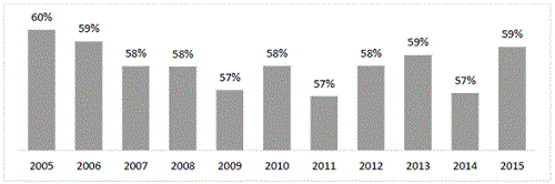 Una medida de los niveles de integración de las economías en las cadenas globales de valor es la relevancia de los bienes intermedios en las importaciones, pues estos usualmente son utilizados para realizar un proceso de transformación que añada valor. Durante el periodo analizado, estas importaciones correspondieron al 58% del total de las importaciones manufactureras de México (Figura 5), lo cual indica que gran parte del comercio se lleva a cabo con el fin de desarrollar actividades de procesamiento.