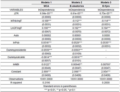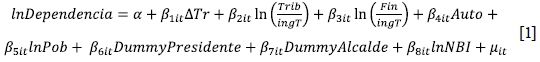 Para la ecuación anterior, In Dependencia representa el logaritmo natural, la participación porcentual de las transferencias dentro de los ingresos totales del municipio; el logaritmo natural de los ingresos tributarios sobre los ingresos totales;