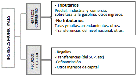 Ingresos corrientes, los cuales son recibidos por los municipios de manera regular y corresponden a funciones y competencias de cada entidad territorial. Entre ellos se encuentran los ingresos tributarios y no tributarios.