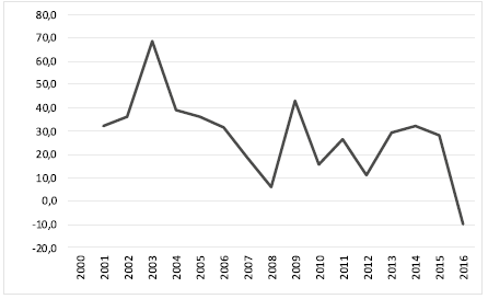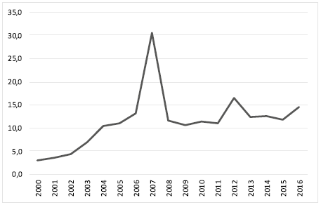 La evolución de este indicador (Figura 10) muestra un ritmo ascendente al inicio del periodo de referencia, entre los años 2000 y 2007, incrementándose de niveles del 2.98% hasta alcanzar el 30.48 %, para luego caer y estabilizarse en un rango entre el 10% y el 11 %, salvo en el año 2016 que sube al 14.46 %. El dato elevado del indicador en el año 2007 se debe a una reducción en el ritmo de crecimiento de los gastos de inversión en esa vigencia.
