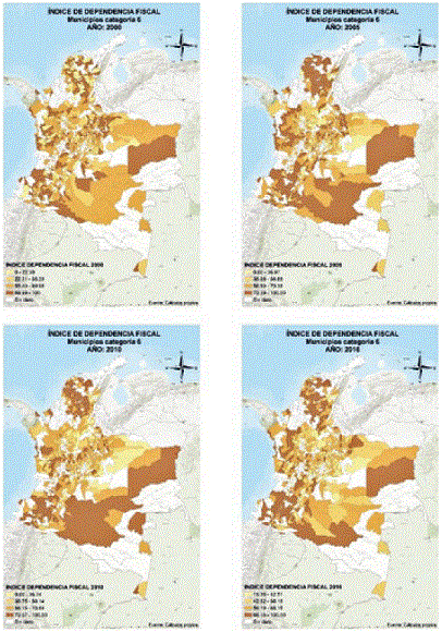 Una forma de evidenciar el comportamiento de la dependencia fiscal en el país para el periodo considerado 20002016, se puede observar a través del siguiente análisis gráfico (Figura 12), en donde se presentan algunos mapas que representan la evolución de la dependencia fiscal.