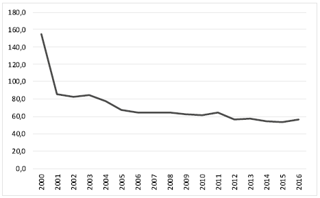 En los municipios objeto de estudio se encuentra que los gastos de funcionamiento absorben una buena parte de los ingresos corrientes de libre destinación, durante todo el periodo analizado (Figura 7). Esta participación porcentual empezó sobrepasando incluso el nivel de los ICLD en el año 2000, pero a partir de ese año, una vez promulgada la Ley 617 de 2000, los municipios se vieron obligados a ir reduciendo los gastos de funcionamiento para ajustarlos al máximo permitido por la norma. Así, desde el año 2001 comienza a reducirse, hasta llegar al 61.63% en 2010, se eleva un poco al año siguiente (64.35 %) y continúa bajando hasta el año 2015 (53.58 %), para cerrar el periodo de estudio con un leve incremento en 2016.