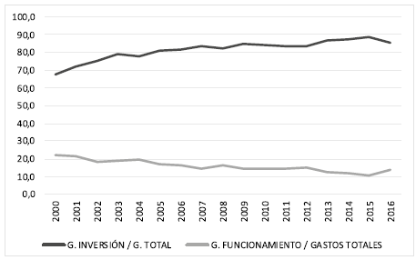 La inversión, como proporción del total de gastos en los municipios de sexta categoría de Colombia, presenta un comportamiento ascendente a lo largo del periodo de estudio, al inicio representa el 67.62% del gasto total, llega hasta el 88.96% en 2015 y muestra una tendencia de crecimiento un poco más acentuada de 2000 al 2003. Tal comportamiento obedece a la promulgación de las leyes 617 de 2000 y 715 de 2001, así como a la estructuración del SGP y el Fondo Nacional de Regalías, lo que generó permanencia y estabilidad a la disponibilidad de recursos para invertir, pero, al ser la mayor fuente de financiación de la inversión, esto hace que las posibilidades de ampliación de la misma sean muy limitadas, ya que eso dependerá de la generación de recursos propios por parte de los entes territoriales.