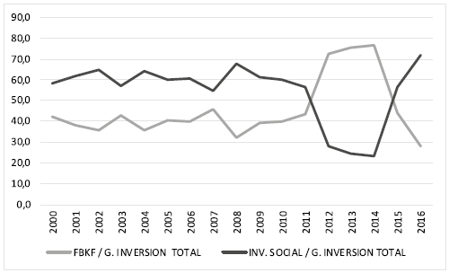 Revisando ahora lo relacionado con los gastos de inversión, para su análisis se calcularon dos indicadores, participación porcentual de los gastos de inversión en el gasto total y la participación porcentual de la formación bruta de capital fijo (FBKF) y de la inversión social en la inversión total, con base en las siguientes fórmulas:
