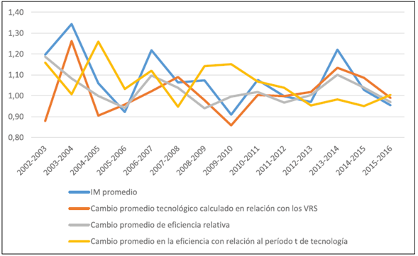 En cuatro periodos existe disminución de la productividad promedio (IM<1), la mayor disminución ocurre en el periodo 2009-2010, durante la primera crisis financiera mundial de este siglo y este comportamiento se debió principalmente al componente del cambio tecnológico calculado en relación con los VRS, a pesar de que el componente del cambio promedio en la eficiencia con respecto al periodo 2009 de tecnología denotó un comportamiento creciente y de mejora en la productividad. Para el último lapso (2015-2016) también se evidencia disminución en el promedio de la productividad, este tiempo coincide con el estancamiento de la economía mundial.
