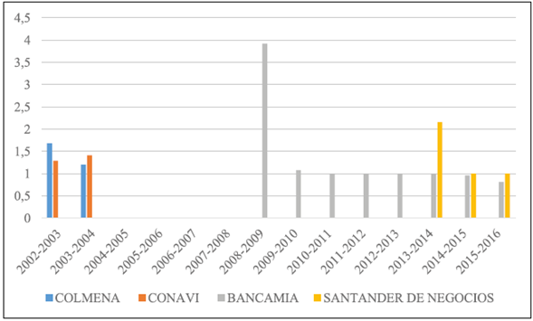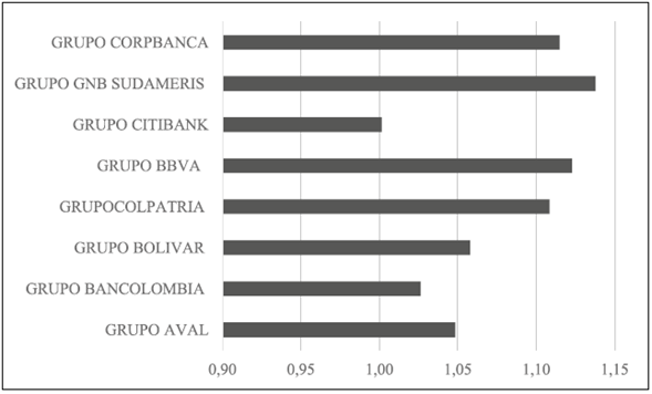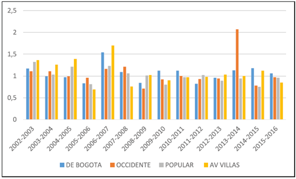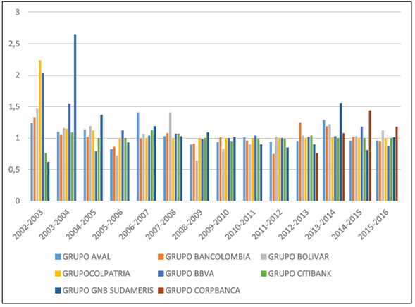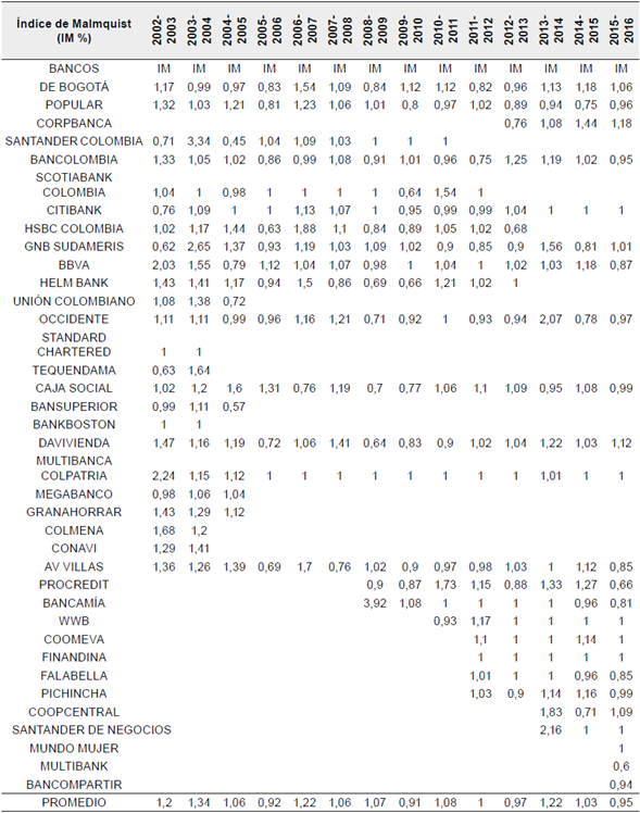 De los 24 bancos que reportaron información a la SFC para el último periodo 2015-2016, el 21 % tiene un IM > 1 y para el 50 % el IM es < 1. Dentro del primer grupo destacan: Corpbanca y Davivienda; ambos tuvieron buenos resultados gracias a la mejora en el componente del cambio de la eficiencia relativa. Para el primer periodo 20022003 también reportaron 24 bancos, pero en este tiempo el 67 % tiene un IM > 1, y el 25 % < 1.