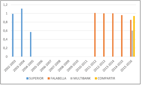 Los bancos que tienen el IM promedio < 1, son: Multibank, Compartir, Superior y Falabella; los dos primeros deben este comportamiento al cambio promedio de la eficiencia relativa, el Superior se lo debe prioritariamente al cambio promedio tecnológico calculado en relación con los VRS, y Falabella al cambio promedio en la eficiencia respecto al período t de tecnología. En la Figura 3 se muestra el comportamiento del IM para estos bancos.