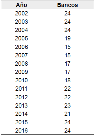 Delimitación de las DMU: dado que se estudia el sector bancario colombiano, las DMU son los bancos que año tras año, y desde el 2002 y hasta el 2016, reportaron sus estados financieros a la Superintendencia Financiera de Colombia; se conformó un grupo de 43 bancos, teniendo en cuenta todos los bancos existentes en el periodo de estudio. Durante este periodo cinco bancos del Gobierno reportaron a la SFC; pero, por ser del Gobierno, se retiraron de la base de datos acogiendo lo expresado por Charnes et al. (1985) en cuanto a que instituciones del Gobierno solo son comparables entre sí. Adicionalmente, un banco privado que fue liquidado en 1999 también reportó sus estados financieros, pero por no ser comparable, porque no estaba en pleno funcionamiento, también se suprimió de la base de datos. En la Tabla 1 se muestra el número de bancos que para cada año hacen parte de la investigación.