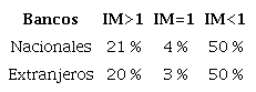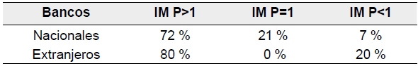 Para el primer periodo de estudio, el 67 % de los bancos tienen el IM > 1 , y el 25 % < 1 . Mientras que para el último periodo es el 21 % y el 50 % respectivamente.