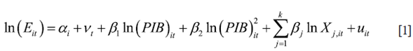 Donde Eit indica la variable de contaminación ambiental (CO2 y N2O), PIB es el producto interno bruto per cápita, Xjit es la matriz de variables que intervienen en la contaminación ambiental (emisiones de metano, uso de energía, valor agregado del sector servicios, valor agregado de la industria, valor agregado de la manufactura, desgaste de los recursos naturales, educación y población), uit es el término no observable (perturbación aleatoria), αi es la heterogeneidad no observable para los países (unidades de sección cruzada) y vt incluye la heterogeneidad no observable en el tiempo. Así mismo, β representa los estimadores y los subíndices i,t indican observaciones para distintos individuos (países) y periodos de tiempo.
