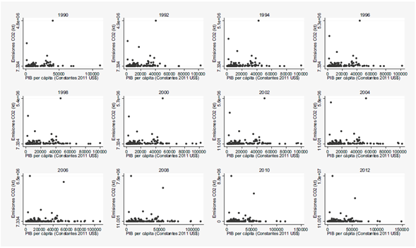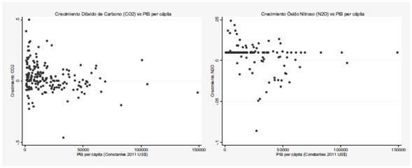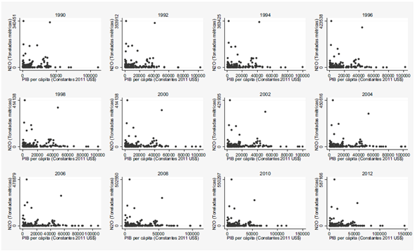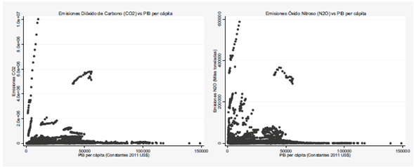 La Figura 1 muestra la relación de las emisiones de dióxido de carbono (CO2) y óxido nitroso (N2O) con respecto al producto interno bruto (PIB) per cápita para 217 países y economías registradas en el Banco Mundial en el año 2012 durante el periodo 1990-2012. Como se puede observar, para ambos indicadores de deterioro ambiental un aumento del PIB per cápita está relacionado con una disminución en las emisiones de CO2 y N2O.