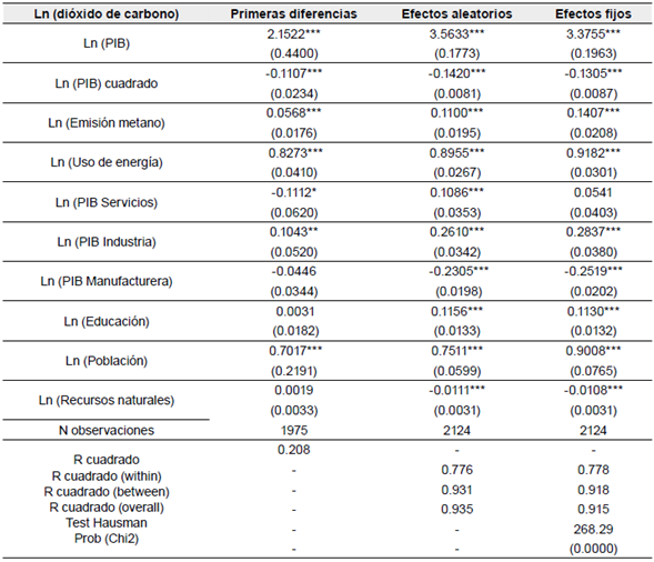La Tabla 1 muestra los resultados de las tres alternativas de estimación para las emisiones de dióxido de carbono (CO2); así mismo, se presenta al número de observaciones, R cuadrado17, R cuadrado within18, R cuadrado between19, R cuadrado overall20 y la prueba de Hausman. Como se puede observar, las estimaciones comprueban que existe una relación de U-invertida entre las emisiones de dióxido de carbono (CO2) y el PIB per cápita para primeras diferencias (β1 = 2.1522; β2 = -0.1107), efectos aleatorios (β1 = 3.5633; β2 = -0.1420) y efectos fijos (β1 = 3.3755; β2= -0.1305), siendo estadísticamente significativas al 1%; no obstante, el efecto decreciente que tiene el ingreso (PIB per cápita) en la contaminación (emisiones de CO2) es muy bajo, es decir, un incremento en el ingreso disminuye muy poco las emisiones de CO2, lo cual conlleva puntos de inflexión implícitos demasiado elevados21 para la literatura existente22. En materia de producción de energía, un incremento del 1 % en el uso de energía aumenta las emisiones dióxido de carbono en 0.827 %, 0.895 % y 0.918 % para primeras diferencias, efectos aleatorios y efectos fijos respectivamente. Como era de esperarse, un aumento del 1 % en el ahorro por evitar el agotamiento de los recursos naturales generados de la actividad productiva, reduce la contaminación ambiental por CO2 en 0.011 % para efectos aleatorios y 0.0108 % para efectos fijos. Con respecto a la actividad económica, los resultados muestran que las actividades de industria y servicios tienen una elasticidad promedio positiva en las emisiones de CO2 (excepto en primeras diferencias); no obstante, la actividad industrial manufacturera tiene un efecto negativo, esto se debe principalmente a que esta actividad económica se caracteriza por procesos productivos que reducen parcialmente la contaminación ambiental. El ahorro en el gasto de educación y la población incrementa las emisiones de dióxido de carbono. Finalmente, al aplicar la prueba de Hausman se establece que la heterogeneidad no observada entre países esta correlacionada con las variables independientes, esto implica que se debe utilizar el método de efectos fijos, cuya variabilidad en la contaminación está explicada principalmente por la variabilidad en las variables independientes entre países (R cuadrado between).