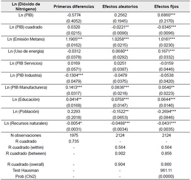 De igual manera, la Tabla 2 presenta las estimaciones para el óxido nitroso (N2O). Los resultados muestran que existe una relación de U invertida entre las emisiones de N2O y el PIB per cápita para efectos fijos (β1= 3.3755; β2= -0.1305), estadísticamente significativo al 1 %, con un punto de inflexión implícito de 20 786 dólares. Según la prueba de Hausman, el método de efectos fijos es consistente, debido a la correlación que existe entre las variables independientes y la heterogeneidad no observada entre países; así mismo, en términos de variabilidad, se puede observar que en el método de efectos fijos el 86 % de la variabilidad en las emisiones de N2O se explica por los cambios en las variables independientes entre países (R between). Con relación a la eficiencia energética, los resultados establecen que un incremento en 1 % en el uso de energía aumenta la contaminación por óxido nitroso en 0.167 %; en materia de protección de los recursos naturales, un aumento de 1 % en el ahorro para evitar agotamiento de los recursos naturales, reduce las emisiones de N2O en 0.043 %. Las estimaciones para la actividad económica muestran que un aumento de la industria y los servicios23 tiene un efecto negativo; todo lo contrario sucede con la industria manufacturera, la cual tiene un efecto positivo en las emisiones de óxido nitroso. Por último, el gasto en educación y la población tiene efectos contrarios, el primero incrementa la emisión de N2O y el segundo la reduce.